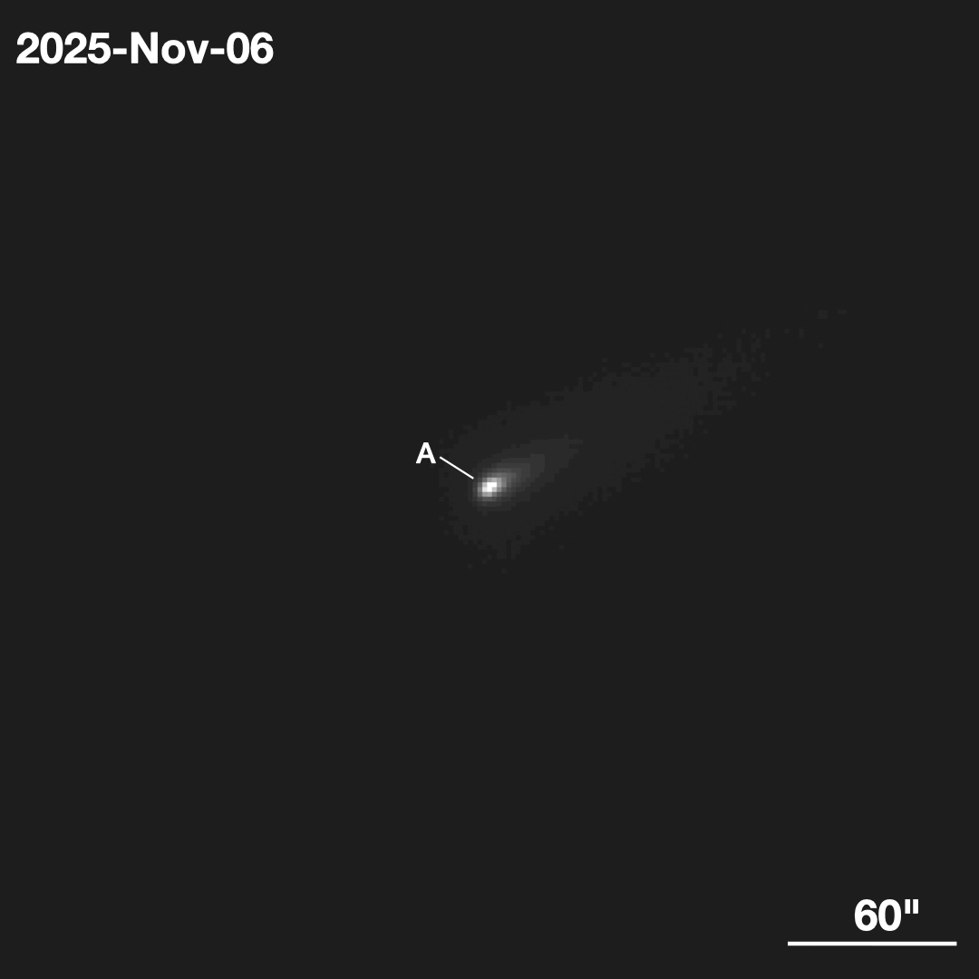 Comet K1 is breaking apart! Comet K1 skimmed just 0.3 AU from the Sun during its perihelion on October 8, and then in early November underwent a dramatic outburst. Then on November 10, observations from Teide Observatory revealed two large fragments — clear evidence the comet had split. Just three days later, a third fragment appeared, indicating that the comet is in pieces. Even more exciting, our citizen science community captured the evolving breakup in real time! Citizen astronomers observed all three fragments, tracking this transformation from around the world. Below you can see Comet K1 before, during, and after the fragmentation, but that’s not all – we still need observations to study what’s left of this comet! After fragmenting, the comet had another close solar approach on Nov 26, but it remains bright as it heads out of our telescopic reach. More data will tell astronomers how the comet fragment continues to evolve after the breakup and solar flyby, so observe while you still can!