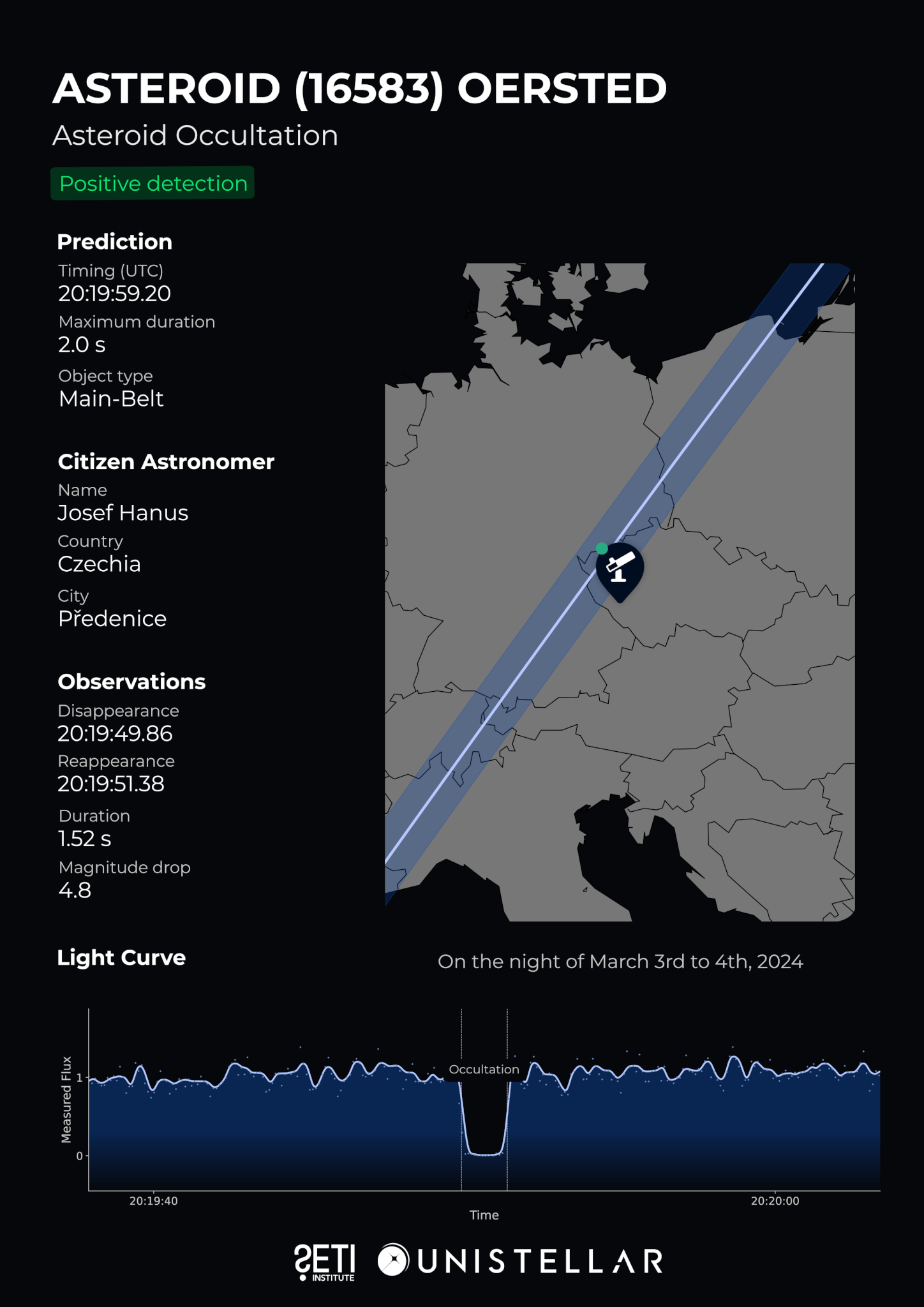 I followed the procedure and … I saw nothing … However, a few days later, I learned that the occultation was clearly visible on the data, that I was the only Unistellar member to have observed it, and that the scientific value was real: the occultation was very brief, therefore particularly difficult. Having observers near and into centrality will allow scientists to better determine the position of the asteroid, and therefore to refine its orbit! What a feeling!