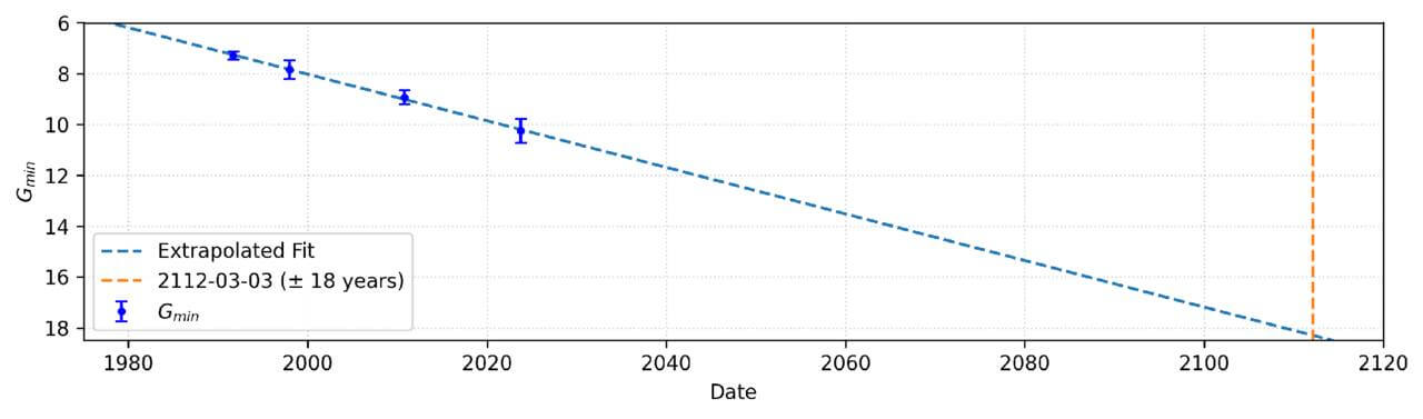 Figure 4 from Graykowski et al. 2025: Measurements of the minimum magnitude (G) of Hartley 2 associated with each apparition. This plot shows the decline in brightness as the magnitude as increaed over time, setting this comet on a course to become inactive by 2112 at the earliest.