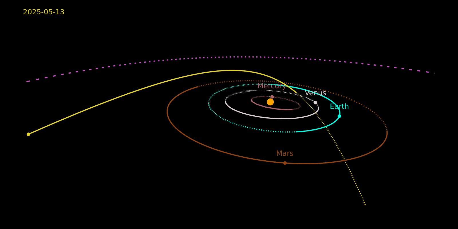 Comet C/2025 K1 (ATLAS) is a dynamically new visitor from the Oort Cloud. It will reach perihelion on October 8, 2025, at just 0.33 AU, so intense heating could threaten its survival. If it remains intact, the comet will make two close approaches to Earth: first on August 13 and again on November 26. Between its dramatic brightening around perihelion and the possibility of disintegration, C/2025 K1 promises to be a particularly compelling target to monitor.